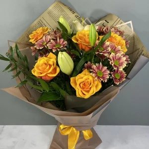 Солнечные объятия - букет из желтых хризантем и гвоздик