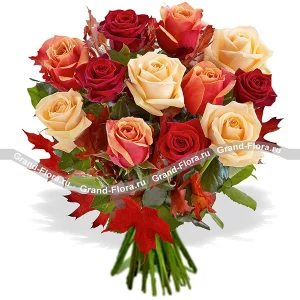 Осенний поцелуй - букет из разноцветных роз и солидаго