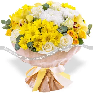 Летние грезы - коробка с желтыми розами и зеленой хризантемой