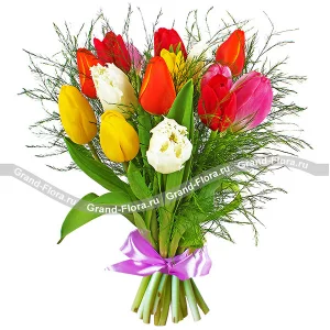 Всегда на высоте - букет из разноцветных тюльпанов с лентой