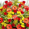 Стандартный (на фото): роза красная - 25 шт., гербера красная - 17 шт., хризантема кустовая желтая - 7 шт., солидаго - 10 шт., лист рабелини - 3 шт., салал, оазис, корзина.