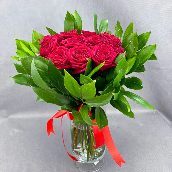 15 роз: роза красная (70см) - 15 шт., рускус (или салал/ малина/фисташка) - 8 шт., упаковка, лента.