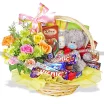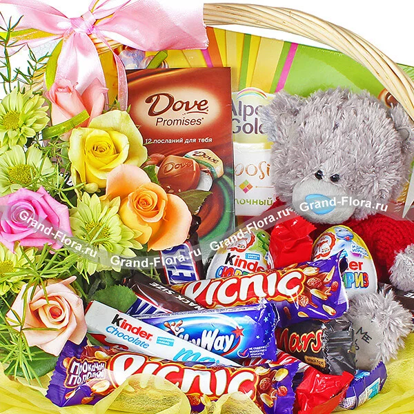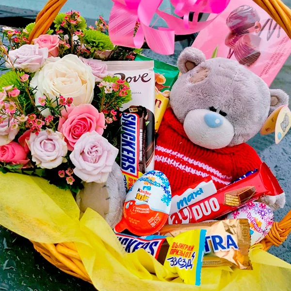 ЛЮКС: роза (микс) - 5 шт., хризантема (зеленая) - 2 шт., декоративная зелень, оазис, корзина средняя, желтый фетр, розово-зеленый бант, мишка "Teddy"(возможна замена на плюшевого мишку) - 1 шт., коробка конфет "Alpen Gold" (163 г.) - 1 шт., шоколад Dove - 1 шт., Яйцо "Kinder" - 1 шт., Snikers (маленький) - 2 шт., Picnic - 1 шт., KitKat - 1 шт., Twix - 1 шт., Kinder Chocolate MAXI - 1 шт..