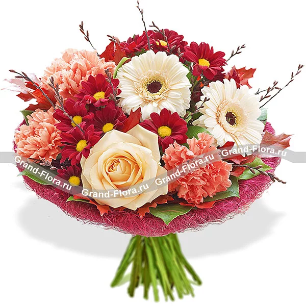 Стандартный: роза кремовая - 3 шт., гербера кремовая - 4 шт., гвоздика розовая - 4 шт., хризантема бордовая кустовая - 4 шт., рускус (салал) - 3 шт., фетр, декор осенние листья.