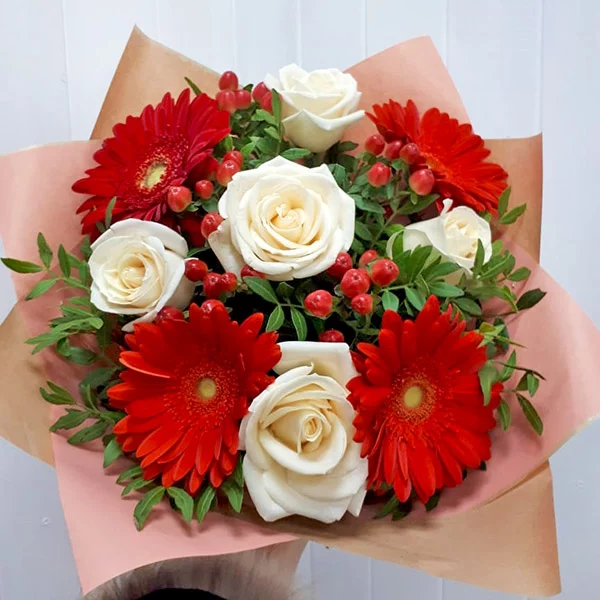 Стандартный: роза белая - 5 шт, гербера красная - 4 шт.,  гиперикум, декоративная зелень, упаковка крафт., лента., Примерный размер: 25Х25 см.