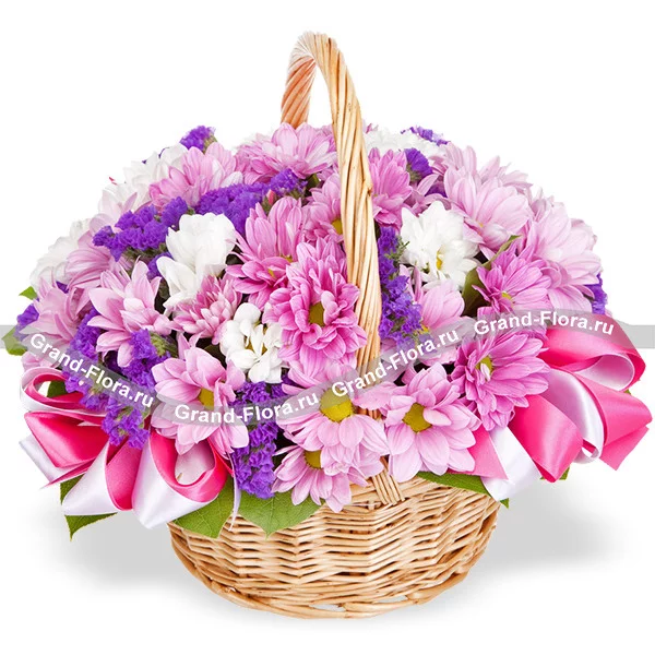 Стандартный: хризантема белая кустовая ромашковидная - 3 шт., хризантема розовая кустовая ромашковидная - 6 шт, статица - 6 шт., декоративная зелень, оазис, корзина средняя.