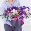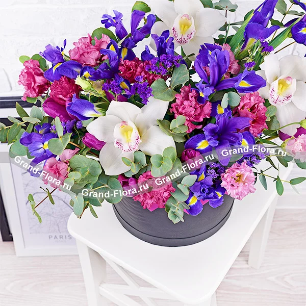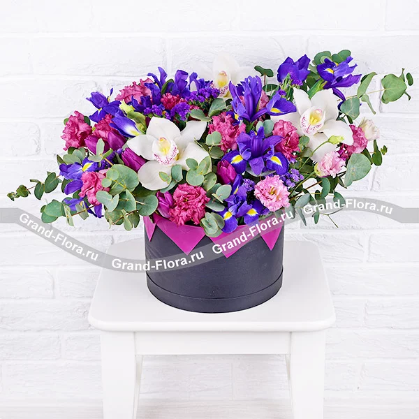 Стандартный: орхидея белая - 1 шт., ирис синий - 7 шт., эустома розовая - 6 шт., тюльпан фиолетовый - 5 шт., эвкалипт, оазис, коробка.