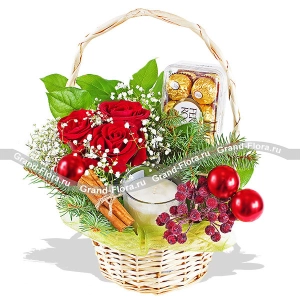 Стандартный: роза розовая - 7 шт., ель, шарики - 5 шт., оазис, коробка.