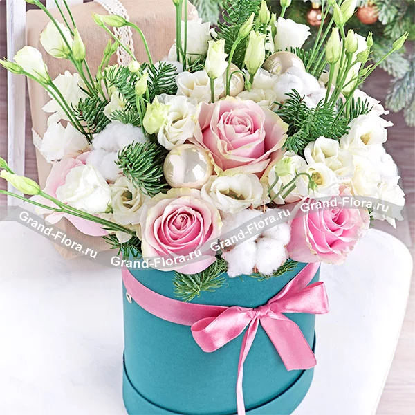 Новогодняя романтика - коробка с розовыми розами и эустомой