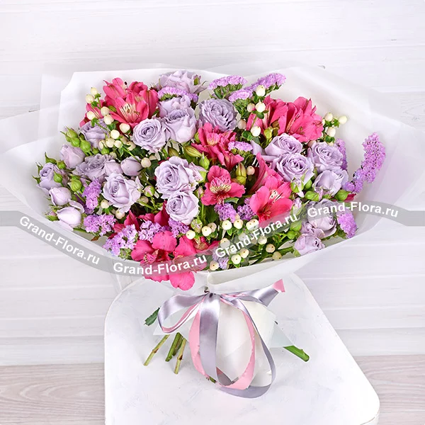 Роза кустовая светло-сиреневая (возможна замена на розовую)- 5 шт., альстромерия розовая/фиолетовая – 5шт., гиперикум белый – 5шт., статица светло-фиолетовая – 3шт., упаковка, лента.