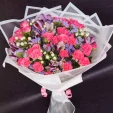 Букет сделали огромный! Фиолетовых роз не было и сделали нежно розовые, но букет все равно отличный. Спасибо довольна безумно.