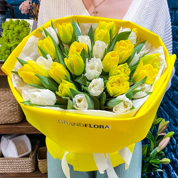 Окутывая солнцем - букет из желтых и белых тюльпанов